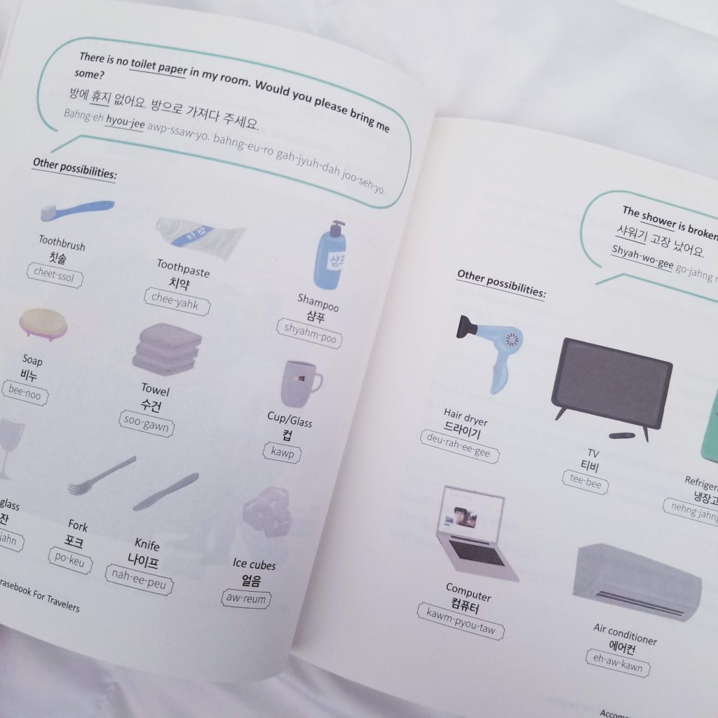 This book is perfect for people who are only going to travel to Korea for vacation or business for a short period of time. I like the size of the book because it’s practical and you can carry it everywhere in your bag. I would never recommend relying on romanization to read Korean (I find it more difficult and not totally accurate). But since the book is focused on travelers, romanization will help travelers to get around Korea comfortably. It’s also useful for Korean learners because you can learn phrases and vocabulary from everyday situations.