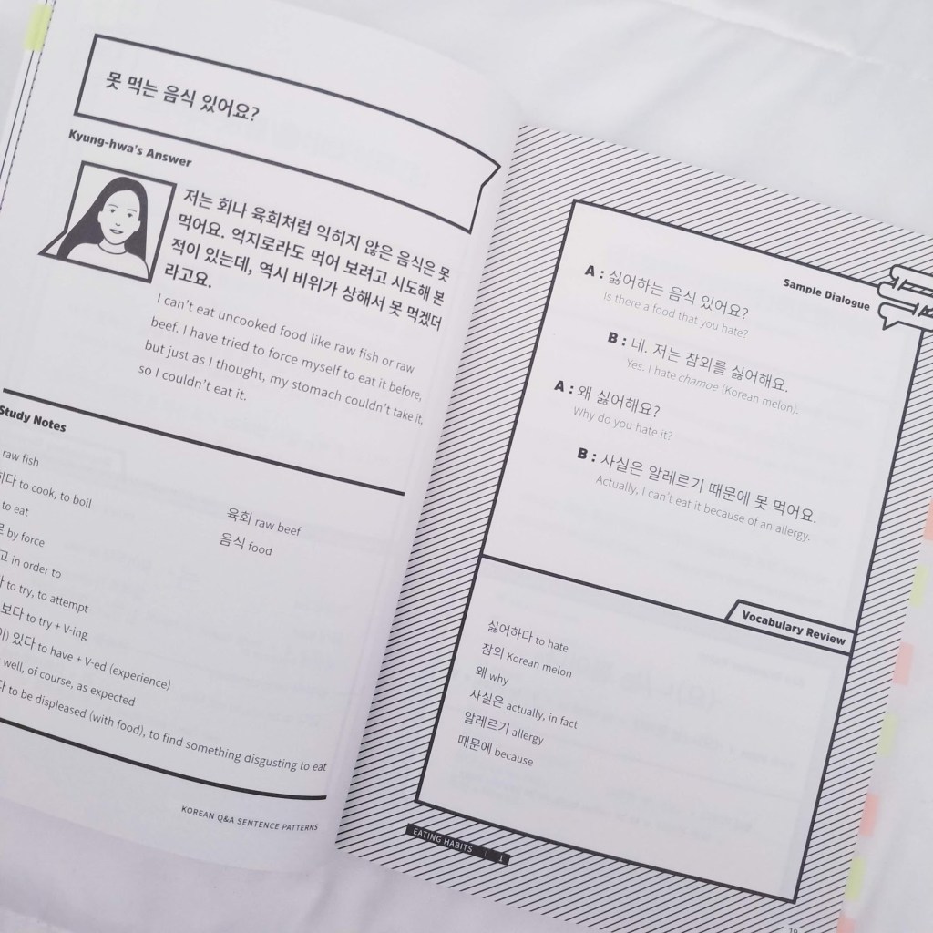 This book will help you to learn how to ask and answer different questions for specific situations. I like that it teaches you different ways to ask the same question also the book is great to learn new vocabulary with context. This book will totally help you to improve your conversational skills in Korean. The book also comes with audio files by native speakers.